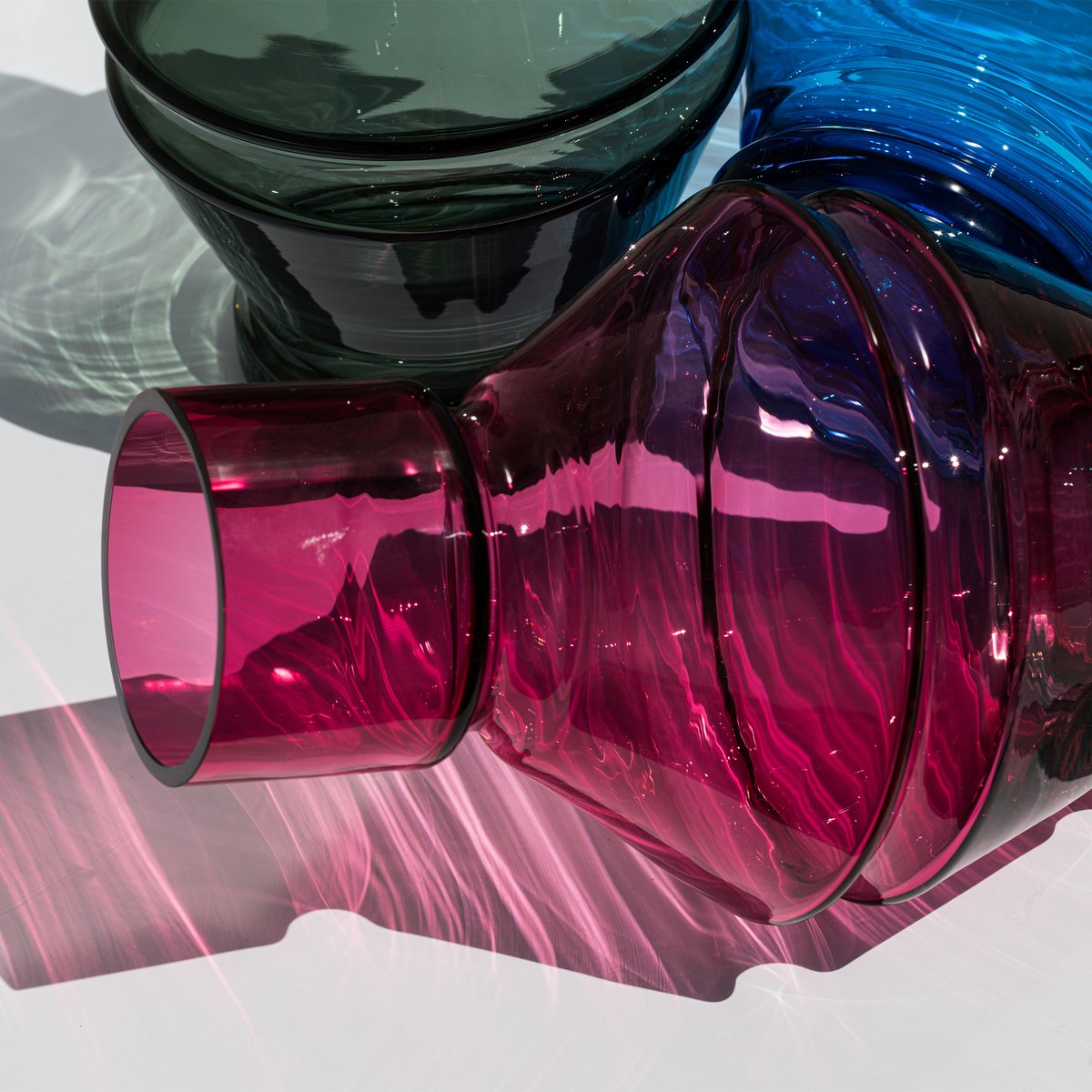 Les nombreux angles de cette collection en verre teinté créent un beau jeu de couleurs et de lumière, en particulier quand les pièces sont remplies d’eau – pour ces objets, l’inspiration de Wiig-Hansen a jailli de sa fascination par les jeux de la lumière qui se réfracte quand elle traverse le verre et l’eau.